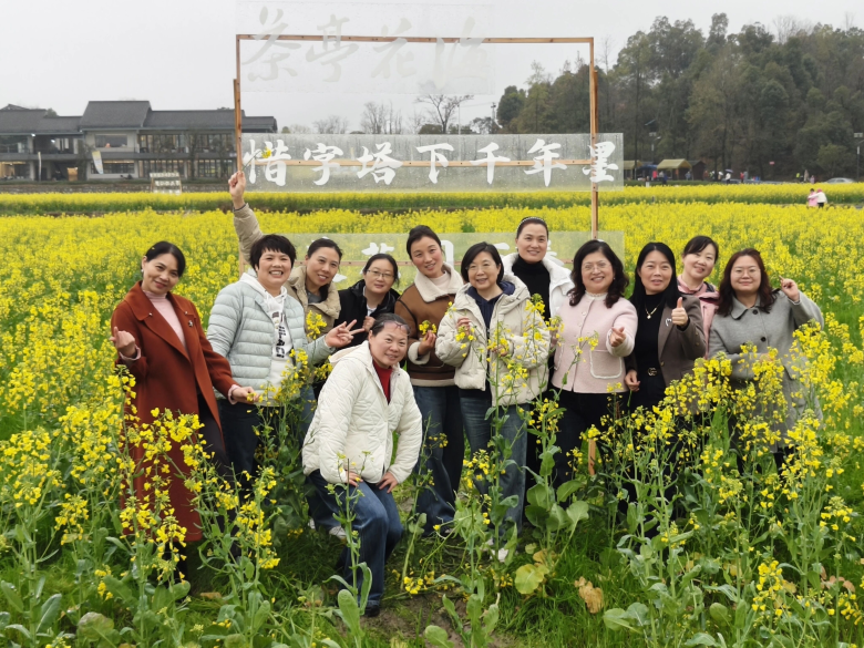 辞别千龙湖,一行人来到茶亭油菜花海。午后薄云漫卷,千亩鎏金菜花与清道光年间所建的惜字塔相映成画,这座五级花岗岩石塔为清光绪年间所建,塔顶遭雷击后,一株朴树破塔而生,塔树共生,成就了 “古塔奇树” 的人文与自然奇观。老师们漫步花间田埂,在古塔与古树的静默守望里,闻着淡淡花香,或驻足凝望,或轻声闲谈,为这一日的春日之旅,添上了悠远而宁静的注脚。
