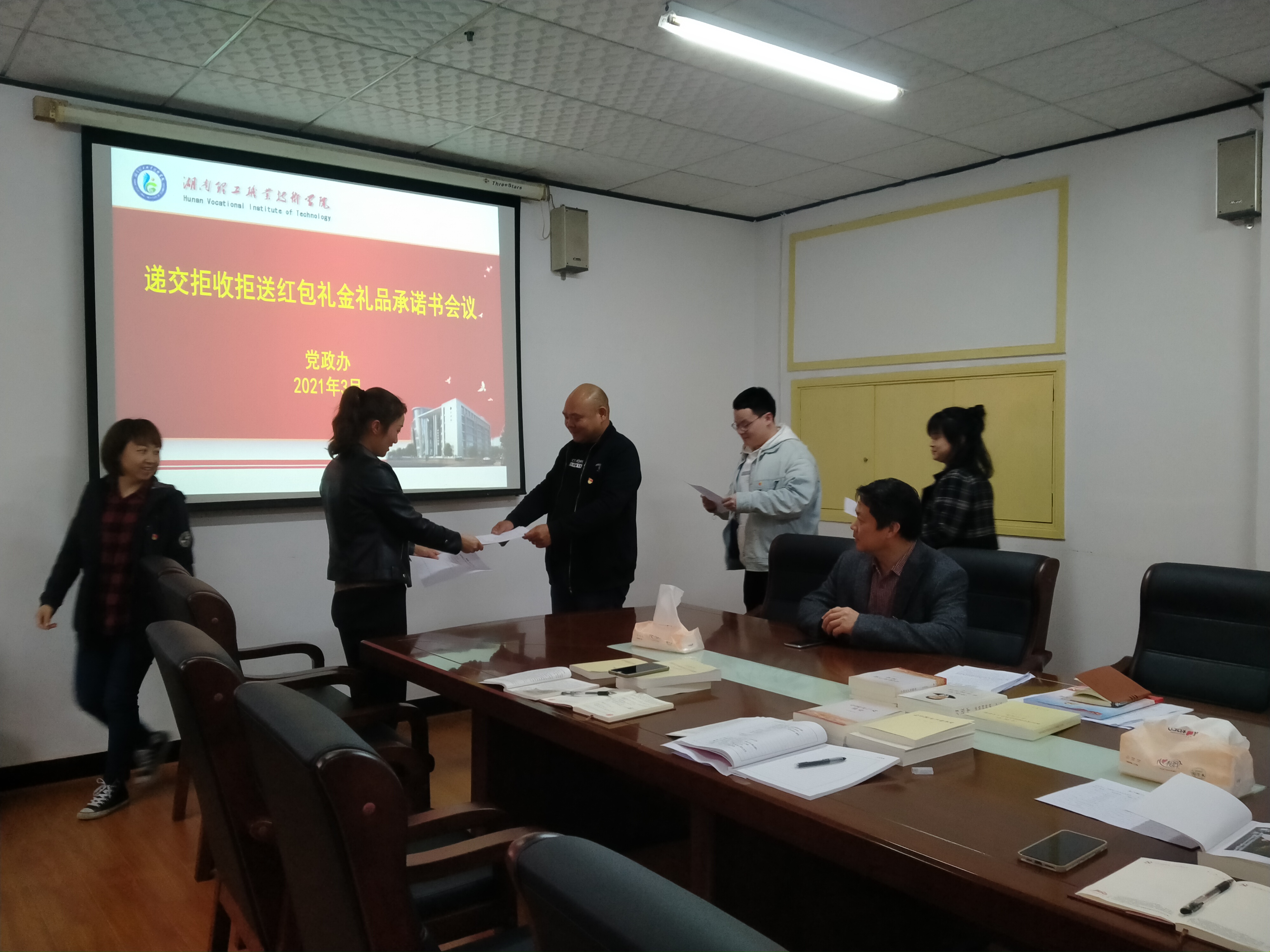 3月31日,为增强广大干部职工廉洁意识和纪律意识,扎实做好党风廉政建设和反腐败工作,深入践行《理工九条》,党政办党支部组织递交拒收拒送红包礼金承诺书。副院长周金玉同志出席指导。