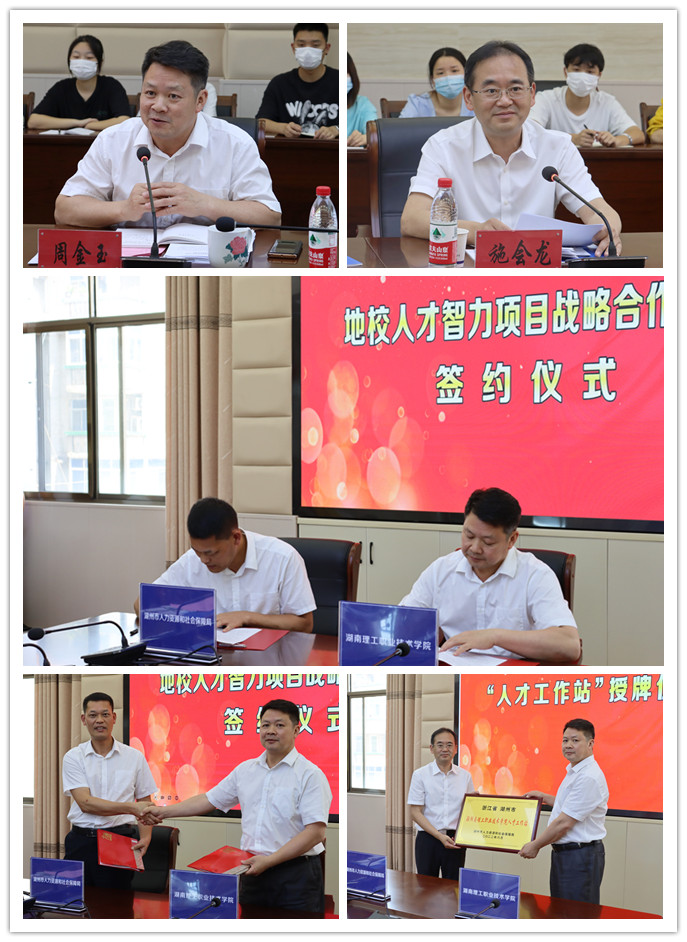 为进一步深化校地、校企合作,加强地方资源优势与高校人才优势相结合,实现校地人才工作资源的优势互补,6月15日,湖州市政协、人力资源和社会保障局等单位赴我院考察交流,与我院签订“深化合作共建 推进人才引进”协议、举行人才工作站授牌仪式。湖州市政协副主席施会龙,湖南理工职业技术学院党委委员、副院长周金玉,湖州市人力资源和社会保障局副局长丁会强等校地领导出席仪式。