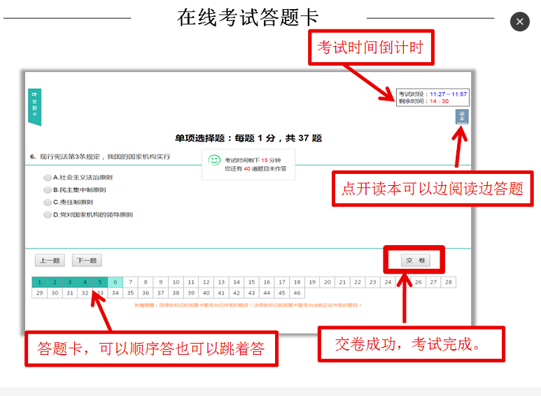 (五)考试规则:开考后30分钟内未登录的学员,取消当场参考资格。当点击“交卷”后,就算提交了考试,学员再不能进行修改。