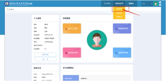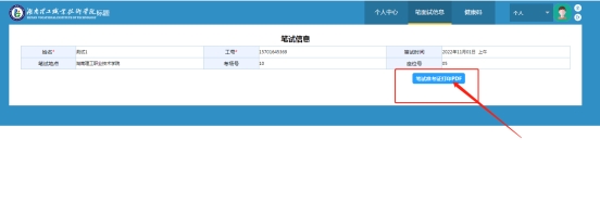 进入个人中心页面后,点击上方【笔面试信息】可查看到“笔试信息”“面试信息”“录用结论”3个子目录,点击【笔试信息】,考生即可看到个人笔试准考证信息,如下图: