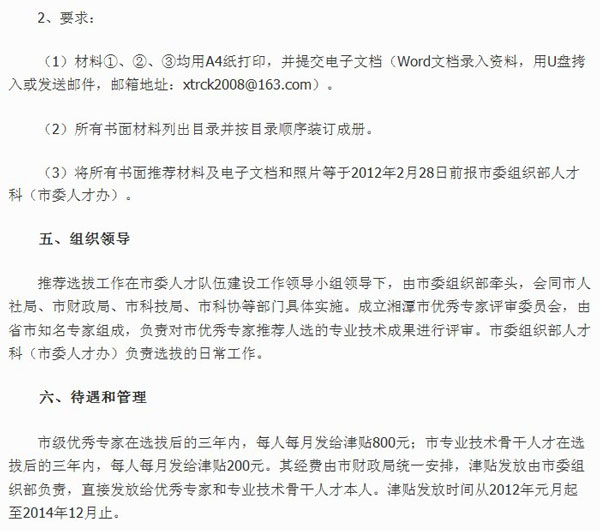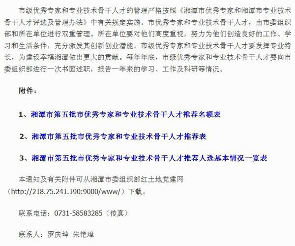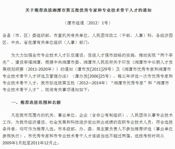 附:《关于推荐选拔湘潭市第五批优秀专家和专业技术骨干人才的通知》(潭市组通【2012】1号)