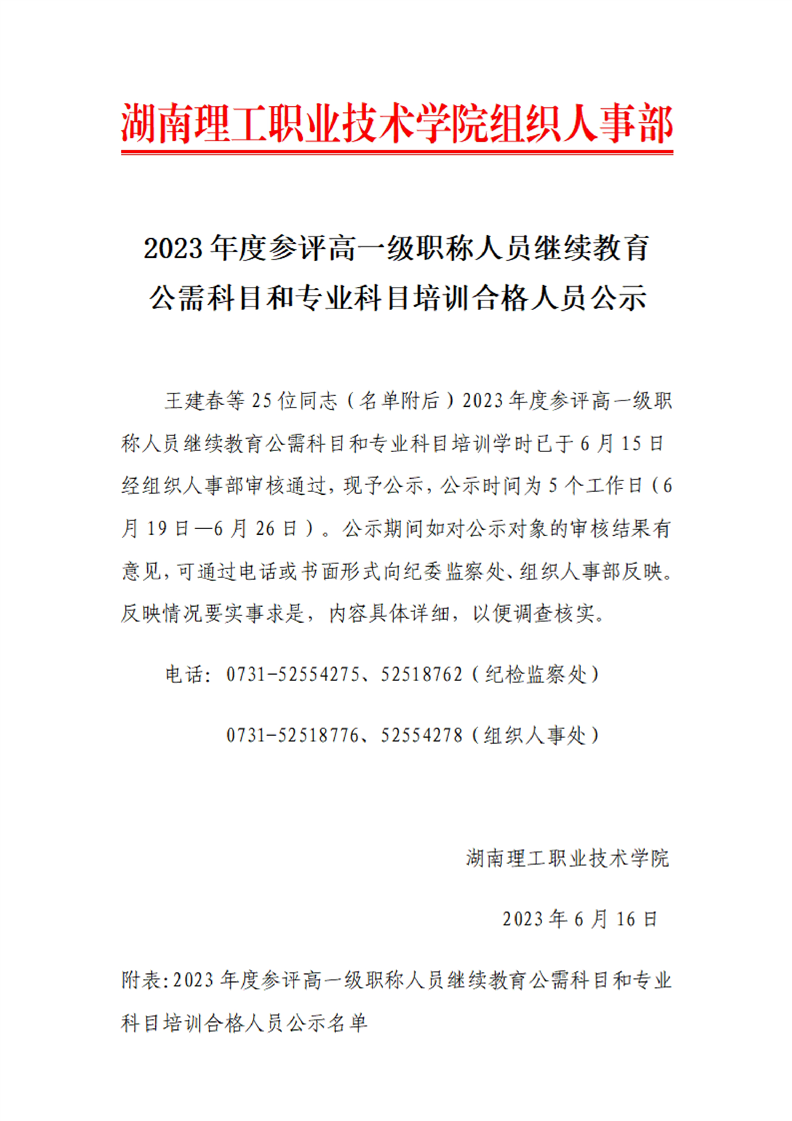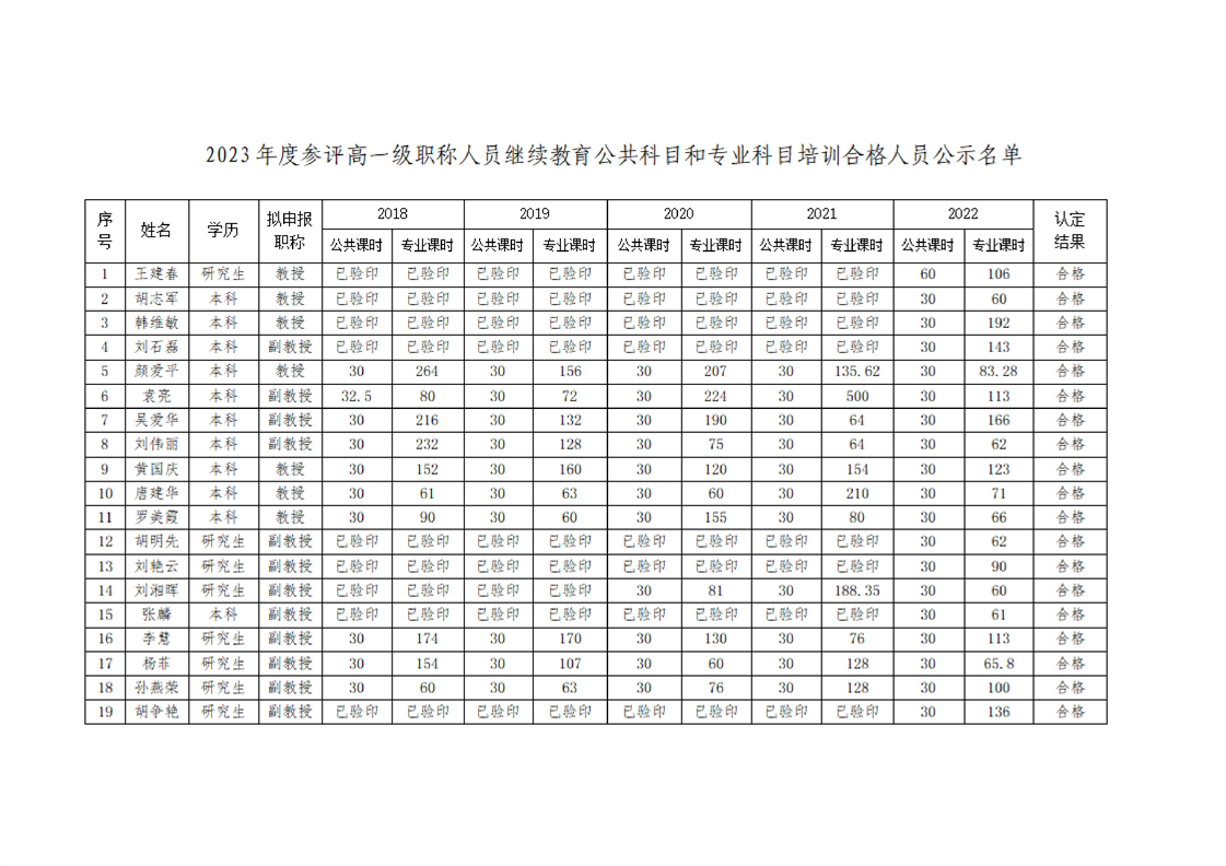 2023年度参评高一级职称人员继续教育 公需科目和专业科目培训合格人员公示