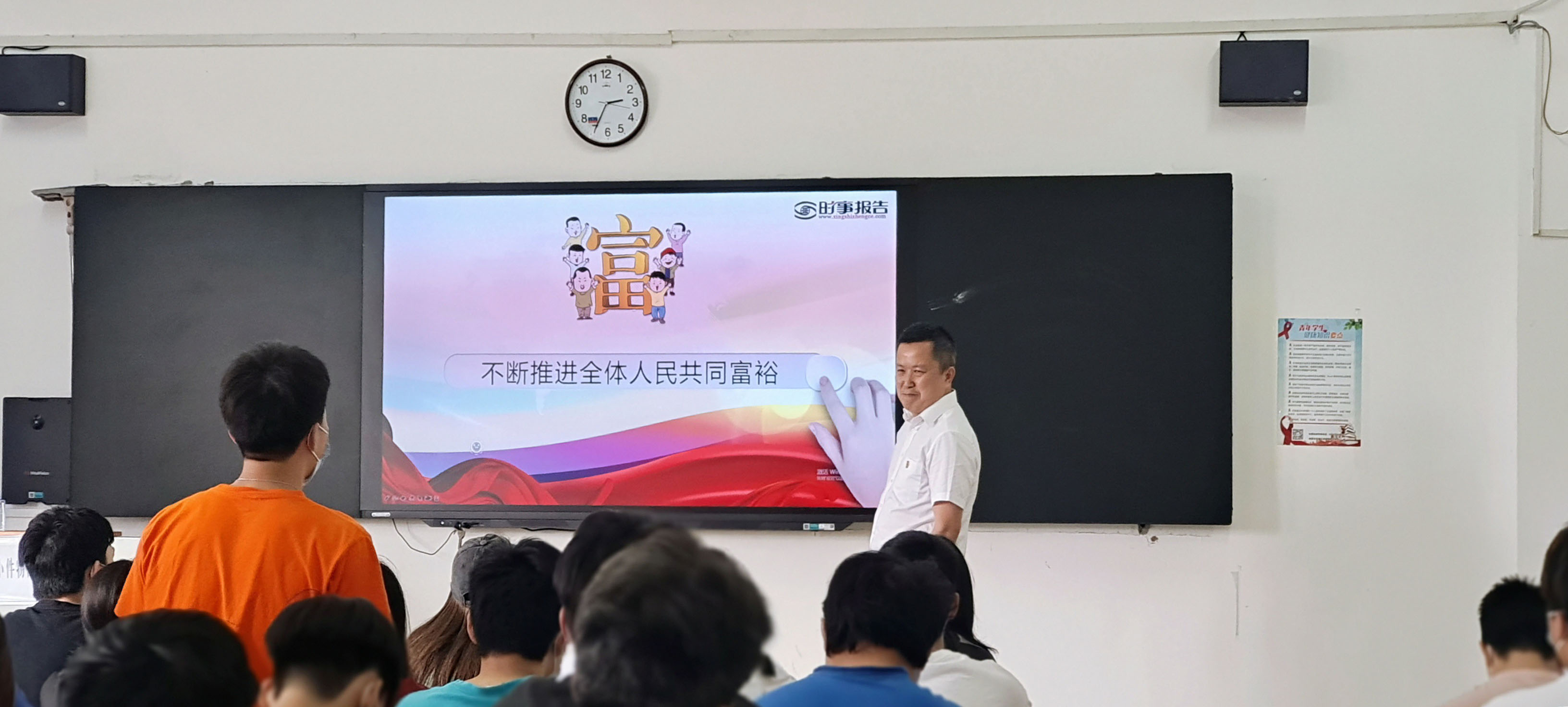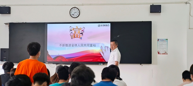 5月23日下午,一堂围绕“共同富裕”的形势与政策课在明理楼南栋405教室火热开讲。学院党委书记叶星成以“不断推进人民共同富裕”为主题,聚焦习近平总书记的“大思政课”的要求,从唯物史观角度,将“中”与“西”,马克思主义基本原理与中华优秀传统文化相结合;“古”与“今”,把“社会大课堂”与“思政小课堂”紧密结合。课堂上,他指出“共同富裕”是中国共产党的初心使命,他以一张毛主席会见老百姓的老照片和同学们分享了几十年来生活质量的变化,回顾了中华民族五千年来对共同富裕的追逐和梦想,探讨了新中国建国以来共产党人对共同富裕的理论发展和实践探索,阐述了“共同富裕”的内涵,回顾了中国站起来、富起来、强起来的历程后,以湖南长株潭发展为实例,立足于时代背景和现实国情,进一步阐述要正确认识和把握实现共同富裕的战略目标和实践途径。
