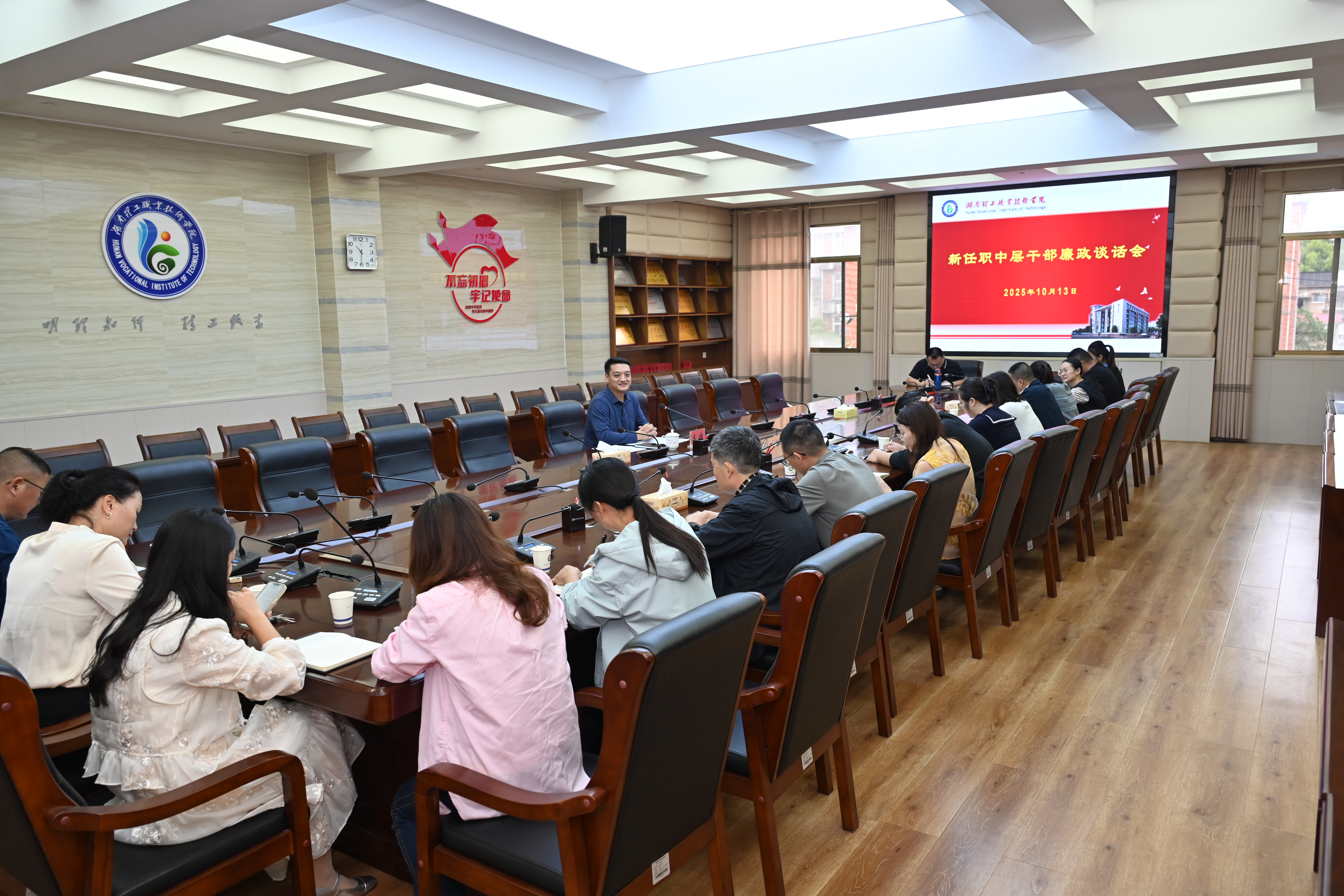 10月13日,我校新任职中层干部集体廉政谈话会在求实楼机关党员活动室举行。校纪委书记高峰参加会议并作廉政谈话,新任职中层干部及纪检监察处全体同志参加会议。 结合当前全面从严治党的新形势新任务,高峰围绕“如何做一名忠诚干净担当的中层干部”主题,对新任职干部提出明确纪律要求。他强调,中层干部是学校事业发展的“中流砥柱”,必须旗帜鲜明讲政治,深学细悟党的创新理论,持续加强政治能力训练,在大是大非面前保持清醒、在风险挑战面前敢于斗争,始终在思想上政治上行动上同党中央保持高度一致。