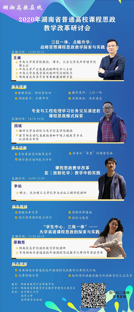 为全面贯彻落实全国和全省教育大会,全国高校思想政治工作会议精神,湖南省高等教育学会教学管理专业委员将于2020年5月15日举办“湖南省高等学校课程思政教学改革研讨会”,会议采用线上直播(湖湘高教在线)的方式进行。请各教学院部组织本部门专业带头人/教研室主任、精品在线开放课程负责人、专任教师参加并结合自身专业或课程建设撰写学习心得(不少于800字+观看截图或照片),于5月20日前交部门汇总后发送至教务处邮箱hnlgjwc@163.com。