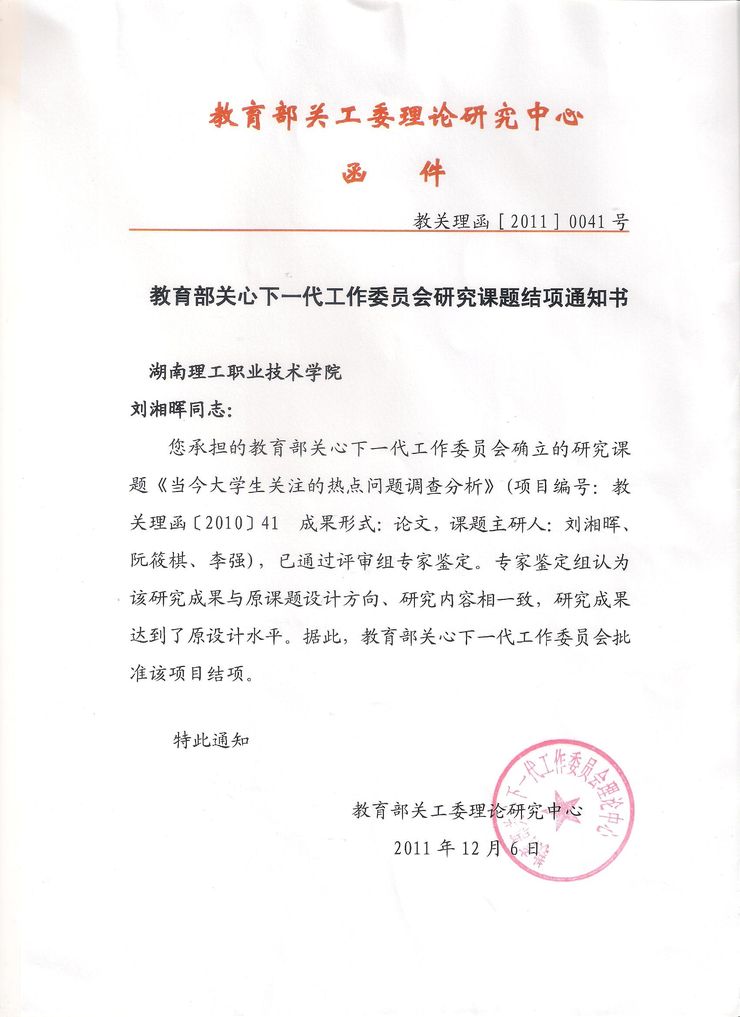 我院承担教育部关心下一代工作委员会的研究课题《当今大学生关注的热点问题调查分析》(项目编号:教关理函[2010]41)顺利结项,教育部关工委在《关于全国教育系统关工委参与2010、2011两年课题研究的情况总结》中,将该课题与中国农业大学、北京交通大学课题一起被教育部关工委树为典范。教育部评审组专家认为,《当今大学生关注的热点问题调查分析》研究成果与原课题设计方向、研究内容相一致,研究成果达到了原设计水平。同时,课题组成员分工明确,结题报告和课题论文齐全,既是实践,也是一份很好的经验。