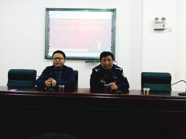 3月28日下午3点,学工保卫处在图书馆二会议室举办了安保队伍2017年第一期业务培训,邀请了建设路派出所张贵义警官来校主讲,会议由学工保卫处副处长李治国主持。参加培训的的有负责保卫工作的老师、护校队全体队员及部分保安队员。
