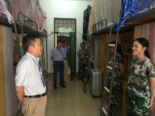 在检查过程中,叶书记一行深入学生宿舍,与新生进行了亲切交谈,详细询问了新生学习、训练和生活等情况,勉励学生要充分利用军训时机,磨练意志,刻苦训练,培养吃苦精神。在宿管值班室,叶书记认真翻阅了辅导员、班主任入宿登记本、学生晚归登记和学生报修登记本,要求宿管员大胆管理,心怀学生,继续为学生提供良好的服务。叶书记一行还仔细查看了学生公寓消防设施情况,详细听取了学生公寓视频监控目前运行状况、对安装门禁系统的可行性进行了实地调查。
