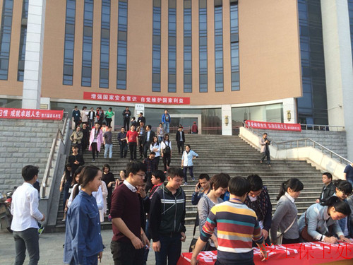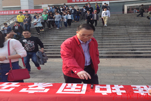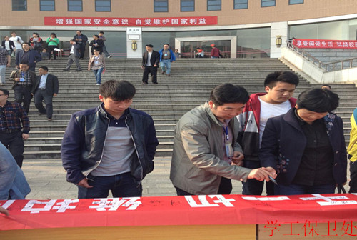 为做好全民国家安全教育日宣传活动,提高广大师生国家安全意识。近日,湖南理工职业技术学院在图书馆组织开展了全民国家安全教育日宣传活动。活动以观看《国家安全法》宣传片为主要内容,学院党委书记秦裕武、副院长朱奇卫、黄霞春等领导亲临会场观看了宣传片,并与同学一起进行了“国家的利益高于一切,维护国家安全和利益,从我做起”的签名仪式。