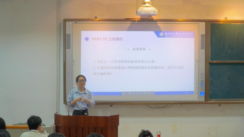 在讲解工作职责时,蔡佳强调心理委员和朋辈互助员是同学们与心理健康教育中心之间的桥梁,不仅要传递信息,更要传递关爱与希望。工作要点方面,蔡佳指出要关注同学们的情绪变化、行为异常等细节,学会辨别常见的心理问题表现形式,做到早发现、早报告。而工作技巧更是干货满满,蔡佳通过生生互动游戏直白地展现了有效沟通的重要性,引导在场学生思考如何运用倾听、共情等技巧让受助者敞开心扉。