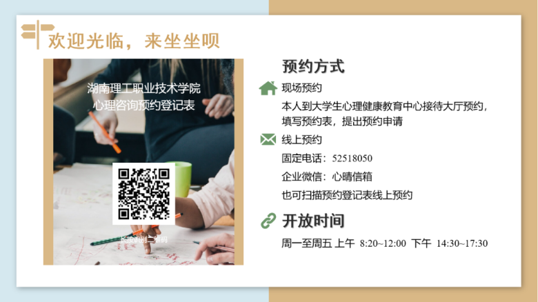 求职和规划未来的过程中,如果遇到心理困扰,别忘了还有这些温暖的“避风港” 全国心理援助热线:12356(24小时) 湖南省高校心理健康公益服务“湘听热线”:400-9229-888(18:30-23:00) 湘潭市免费心理援助热线:0731-55512345(24小时) 学校企业微信搜索“心晴信箱”,或直接扫描下方二维码,预约学校心理咨询。