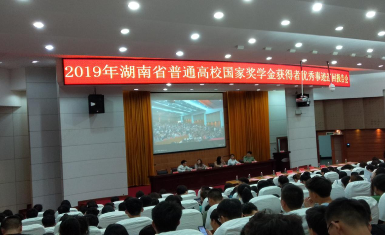 6月5日下午,“资助成才,助我飞翔”2019年湖南省高校国家奖学金获得者优秀事迹巡回报告会在湘潭大学逸夫楼第一报告厅举行,我校派出了41名师生现场聆听报告会。