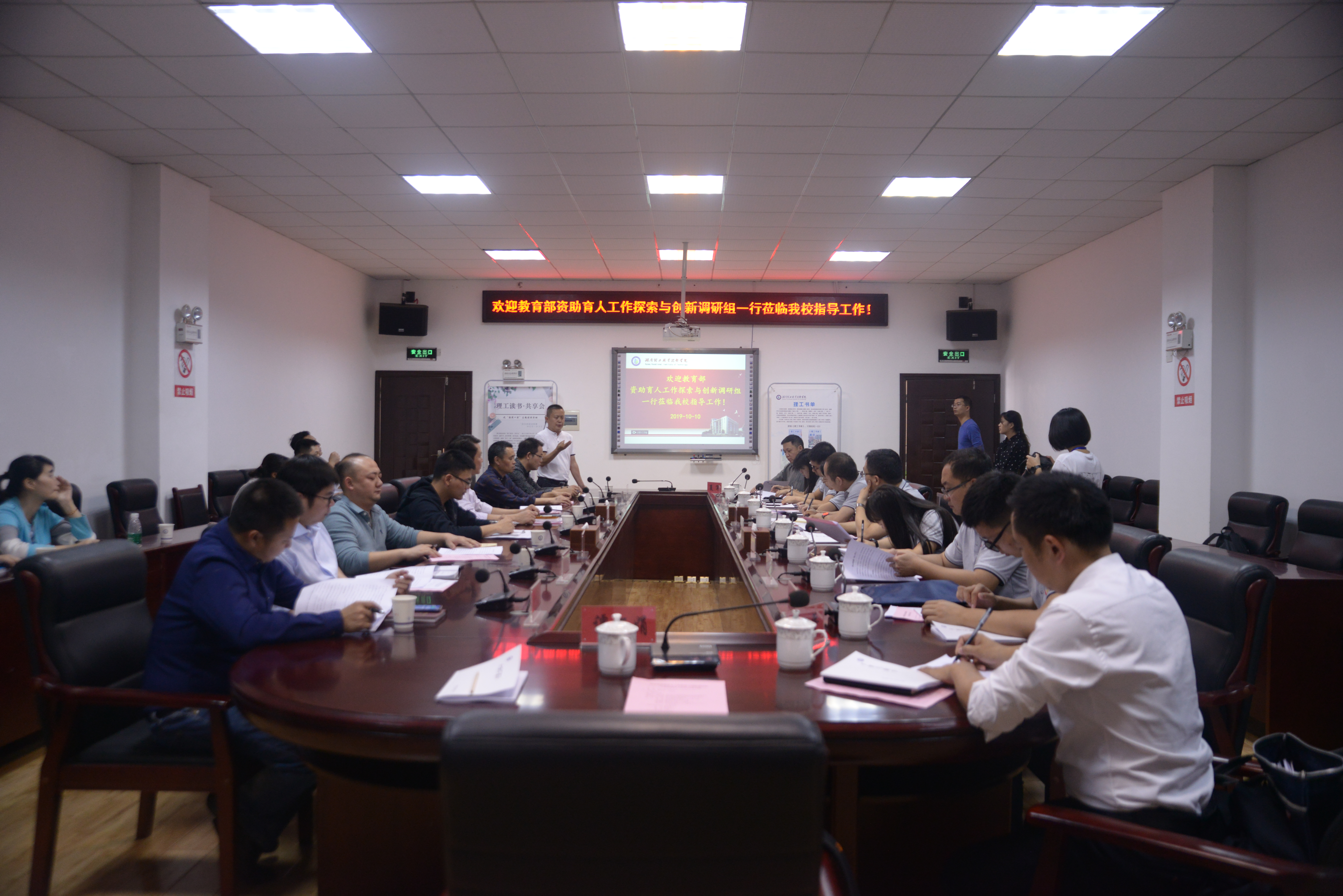 参观结束后,大家前往博学楼一会议室进行调研工作会议,周金玉主持会议并介绍了学校的办学情况,学校教务处、学工保卫处、招生就业处、团委、各二级学院相关工作人员参加会议。会上,学工保卫处处长田野先后从学校资助育人体系建设、育人活动开展等方面进行了汇报。代表团还与师生代表们进行了深入交流。