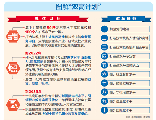 “双高计划”勾勒了总体目标,到2022年,列入计划的高职学校和专业群办学水平、服务能力、国际影响显著提升,为职业教育改革发展和培养千万计的高素质技术技能人才发挥示范引领作用,使职业教育成为支撑国家战略和地方经济社会发展的重要力量。形成一批有效支撑职业教育高质量发展的政策、制度、标准。到2035年,一批高职学校和专业群达到国际先进水平,引领职业教育实现现代化,为促进经济社会发展和提高国家竞争力提供优质人才资源支撑。职业教育高质量发展的政策、制度、标准体系更加成熟完善,形成中国特色职业教育发展模式。