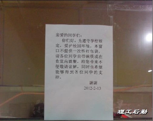 会议上,后勤陈建伟处长就一次性塑料袋(杯)的使用作了具体要求:一是严禁学院食堂及校园商店经营者给消费者提供一次性塑料袋(杯);二是学院食堂及校园商店经营所产生的塑料垃圾需倒置垃圾箱中集中处理;三是校内经营者给消费者提供一次性塑料袋(杯),一经查处,每人次处罚10元。