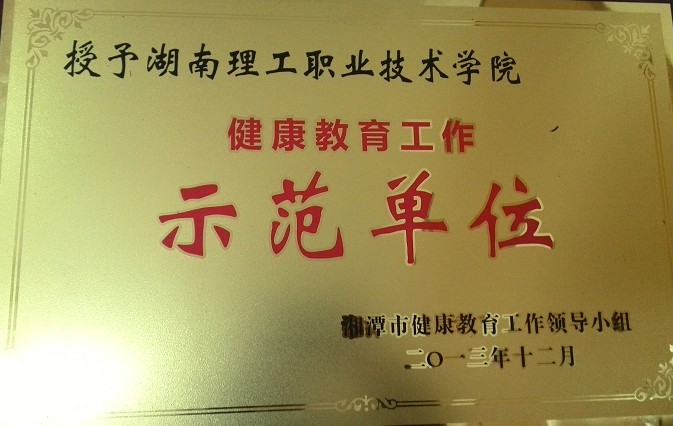 学院多年用心从事人才培养的同时,十分注重师生员工的身心健康教育,充分发挥党、政、工、团的合力,开展形式多样健康教育主题活动,普及《公民健康素养66条》和疾病预防知识,全面提升师生健康素养水平。2013年12月,经民主推荐、现场暗访、网络公示、专家评审等程序后,湘潭市健康教育工作领导小组评选出了9家“湘潭市首批健康教育工作示范单位”,湖南理工职业技术学院是获此殊荣的唯一一家大中专院校。