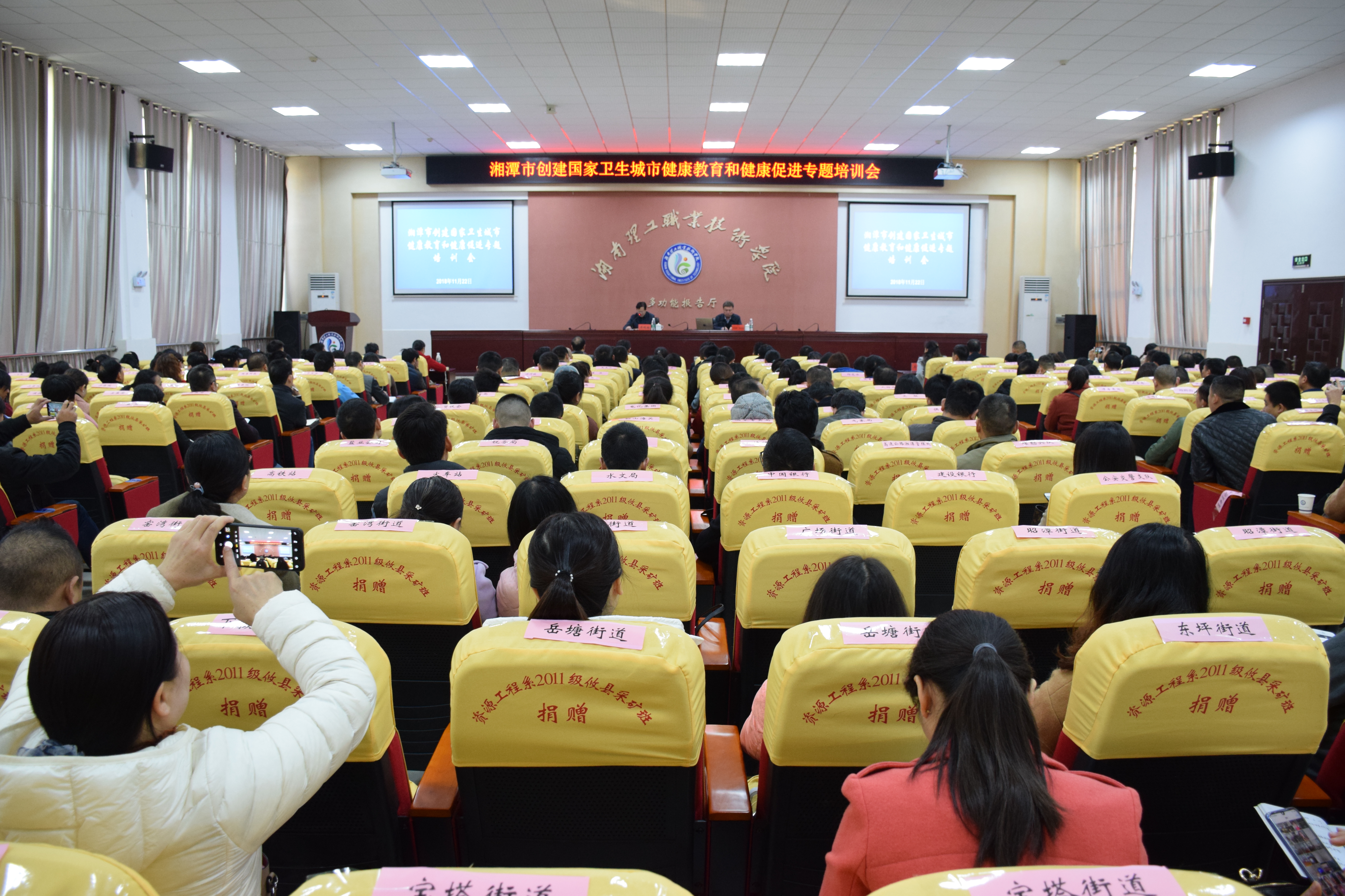 11月22日上午,湘潭市健康教育和健康促进创卫知识专题培训在我校举行。市政协副主席、市创卫领导小组副组长、市创卫办主任周佩珞及相关创卫专家、领导出席会议,133家直单位、高等院校、厂矿企业、驻潭单位;13家市直医疗卫生单位;18家市直学校;28家城区(园区)乡镇、街道;4家大型星级宾馆、酒店共300余人参加了会议。