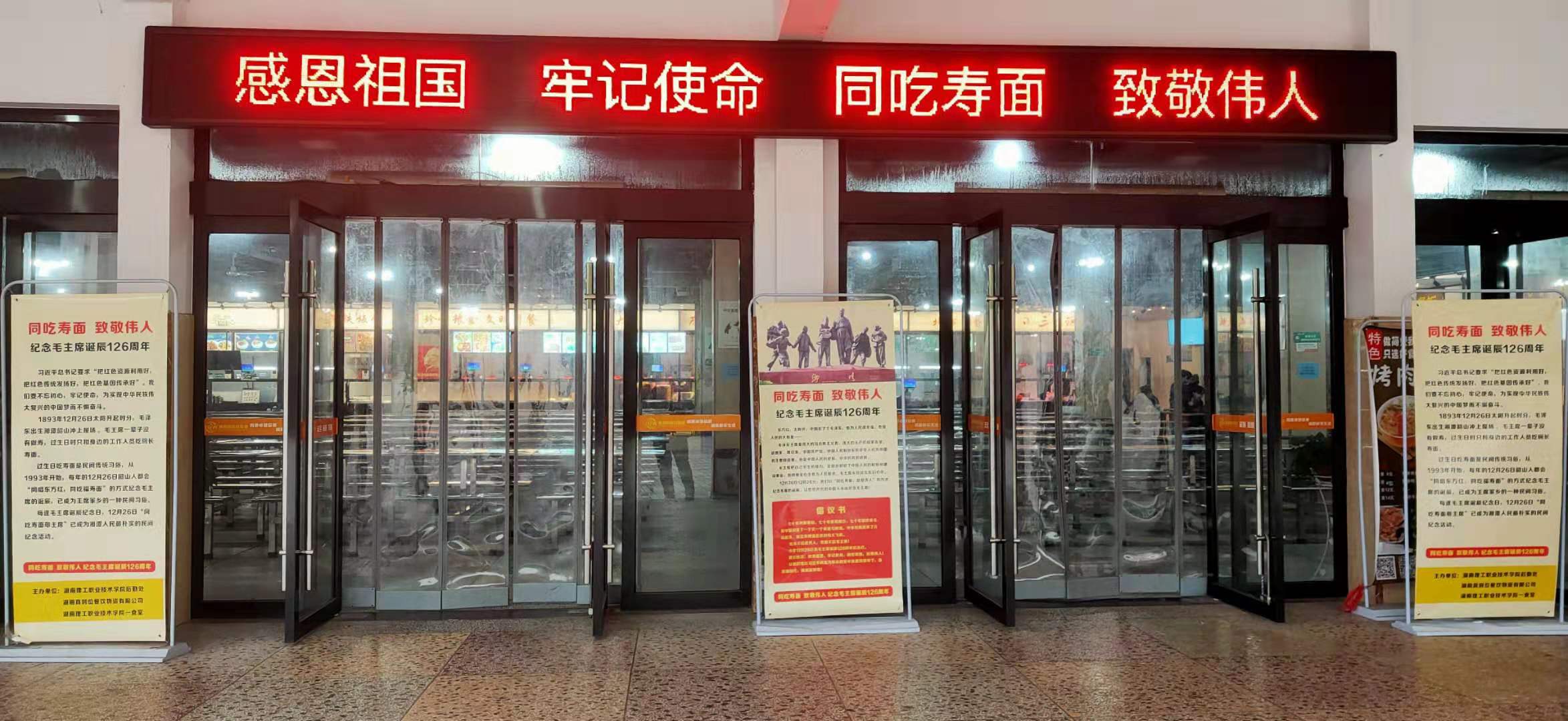 值伟大领袖毛泽东诞辰126周年之际,湖南真到位餐饮物资有限公司在我校一食堂组织开展了一场“师生同吃福寿面 致敬伟人毛主席”的纪念活动。