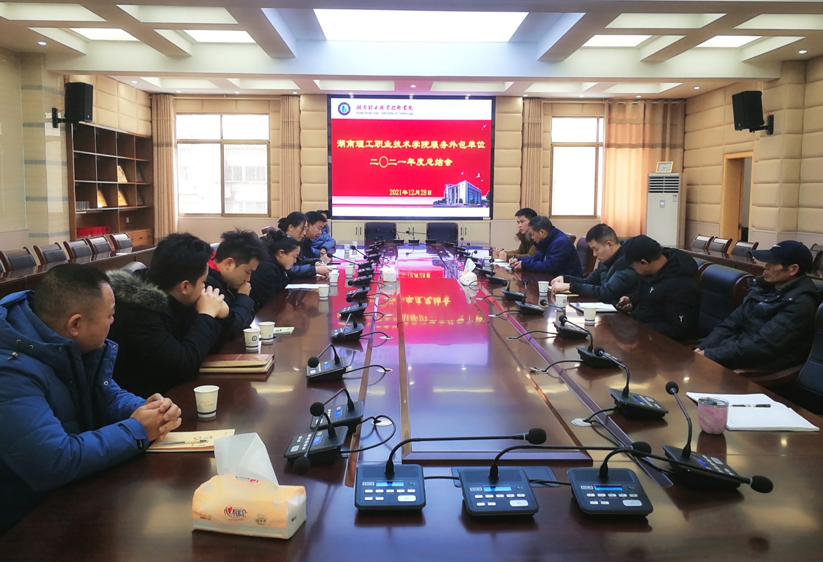 为有力保障学院发展,贴心服务广大师生,12月28日上午,后勤处组织食堂托管单位、物业公司、热水和直饮水供应商、洗衣机服务商负责人或代表,以及后勤处相关工作人员,召开了服务外包单位二〇二一年度总结会,会议由后勤处副处长昌建强主持。