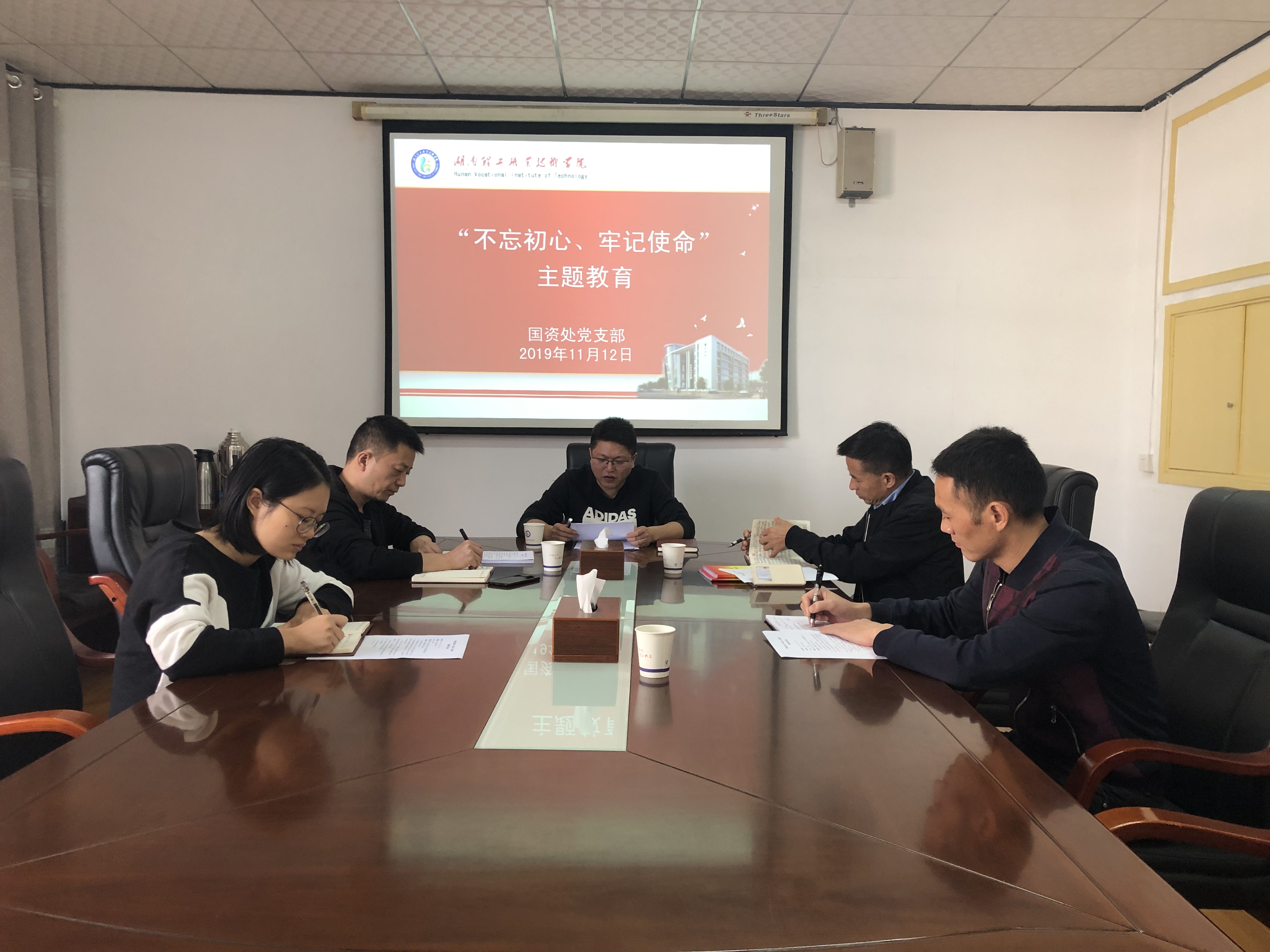 为进一步扎实开展“不忘初心、牢记使命”主题教育活动,根据学院主题教育领导小组办公室安排,11月12日上午,国资处党支部在求实楼三楼会议室召开主题教育集中学习,会议由支部书记罗毅同志主持,全体党员参加。