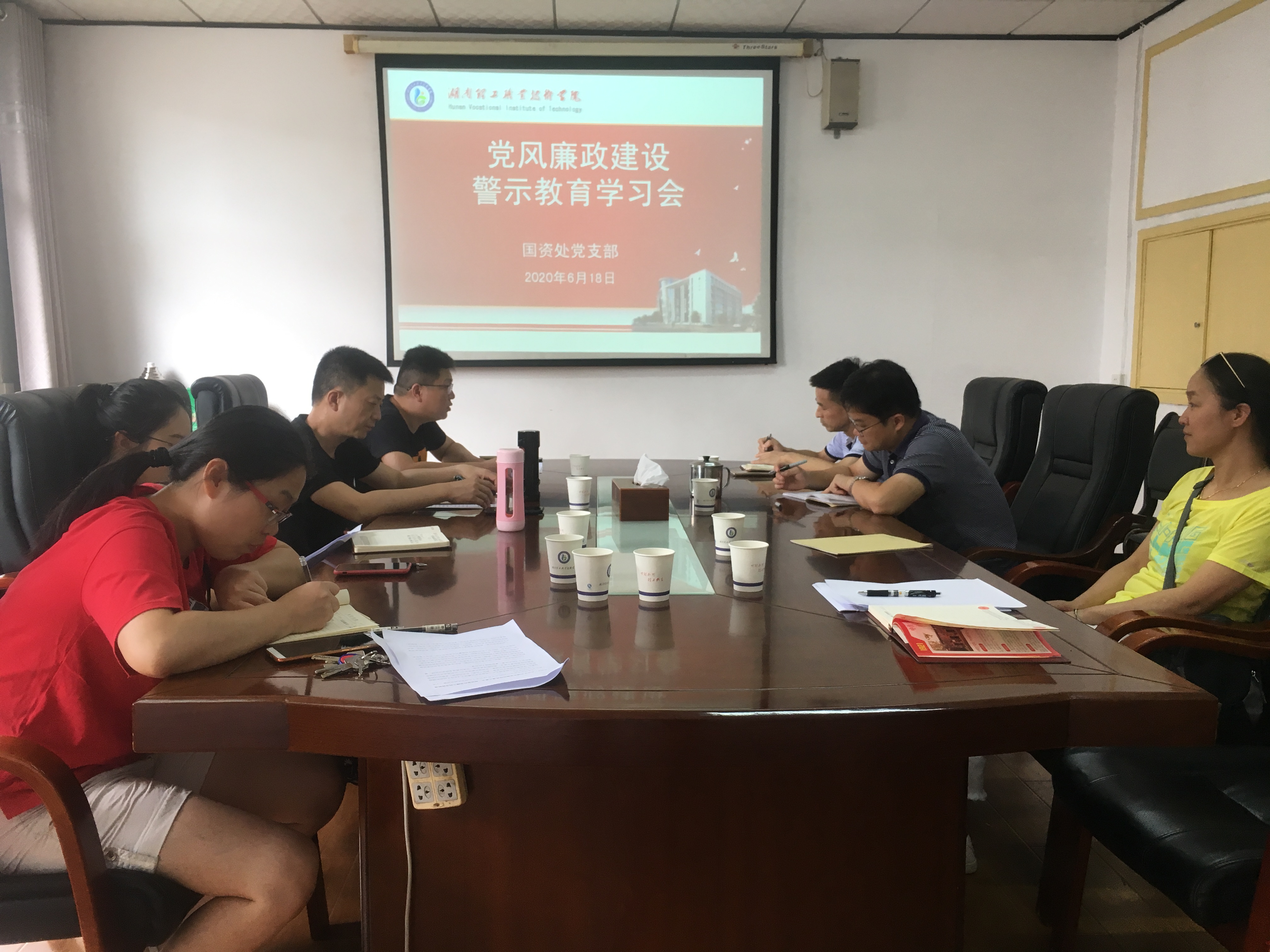 为深入贯彻落实全面从严治党、从严治校要求,切实加强廉政风险防控,进一步增强党员和职工的拒腐防变能力,6月18日下午,国资处党支部召开党风廉政建设警示教育学习会,会议由国资处党支部书记罗毅同志主持,会议邀请学院副院长洪丕庆同志,学院纪委书记、国资处联点委员刘洋同志到会指导,全体党员和职工参加会议。