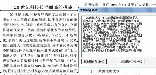 图标,直接选择文字,或者选择菜单栏上的“工具”菜单,选择“文本选择”子菜单,然后选择所需要的文字,单击右键,选择“复制”,或者说选择“发送到WORD”,程序将会把该段文字发送到指定的WORD文档或者是新建WORD文档(用户自己选择)。