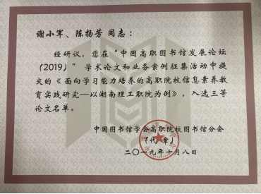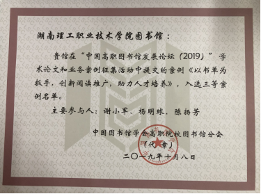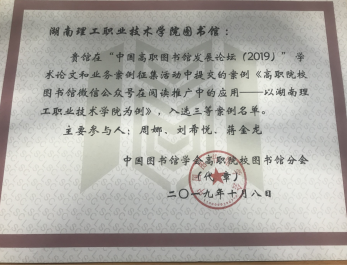 10月16日-19日,我校图书馆参加了由中国图书馆学会高职院校图书馆分会主办的“中国高职图书馆发展论坛(2019)”。论坛以“守初心•担使命•谋新篇一以高职图书馆助力职业教育改革” 为主题,贯彻落实习近平新时代中国特色社会主义思想和国家教育大会精神,聚焦新时代高等职业教育发展对职业院校图书馆的新要求,共同探讨高职院校图书馆创新发展的办法和途径。此次论坛面向中国高职图书馆征集了学术论文和案例,中国图书馆学会高职院校图书馆分会依据中国图书馆学会学术管理的相关规定,组成专家委员会对稿件进行研议,提名了具有一定学术水平和研究价值的作品。我校图书馆谢小军老师、陈扬芳老师撰写的《面向学习能力培养的高职院校信息素养教育实践研究——以湖南理工职院为例》论文荣获三等奖;图书馆提交的《以书单为抓手,创新阅读推广,助力人才培养》、《高职院校图书馆微信公众号在阅读推广中的应用——以湖南理工职院为例》案例荣获三等奖。