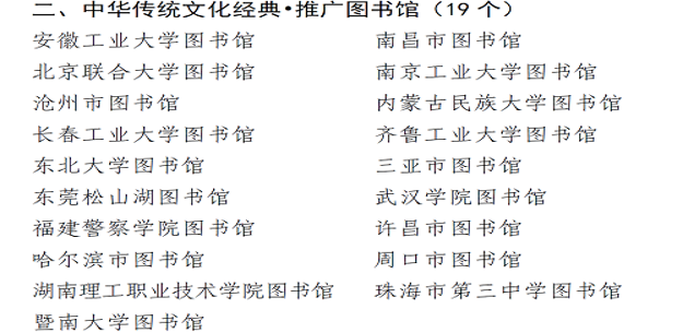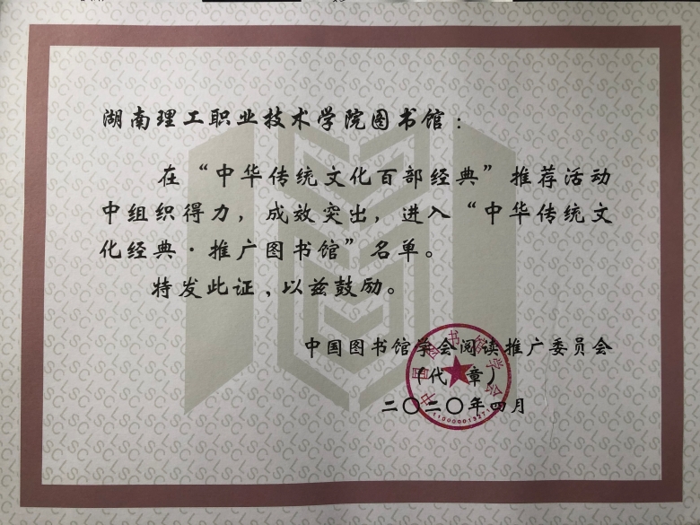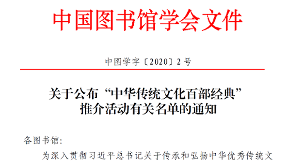 最近,中国图书馆学会公布了“中华传统文化百部经典”推介活动名单,我校图书馆荣获“中华传统文化经典﹒推广图书馆”称号。