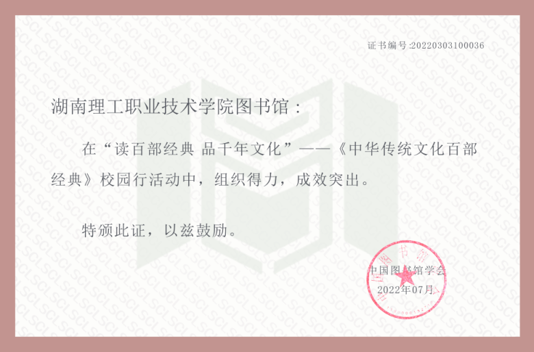 在国家图书馆、中图图书馆学会举办的“读百部经典 品千年文化”——《中华传统文化百部经典》校园行评比活动中,湖南理工职业技术学院图书馆获得了湖南省高职院校第1名,湖南省高校第2名,全国第17名的好成绩,荣获“组织得力”奖,全国仅有100所高校图书馆获此殊荣。同时,17位学生参赛作品进入原著诵读比赛“精选作品”展示名单,1位学生参赛作品进入微书评创作比赛“精选作品”展示名单,1位学生进入“阅读达人”名单。
