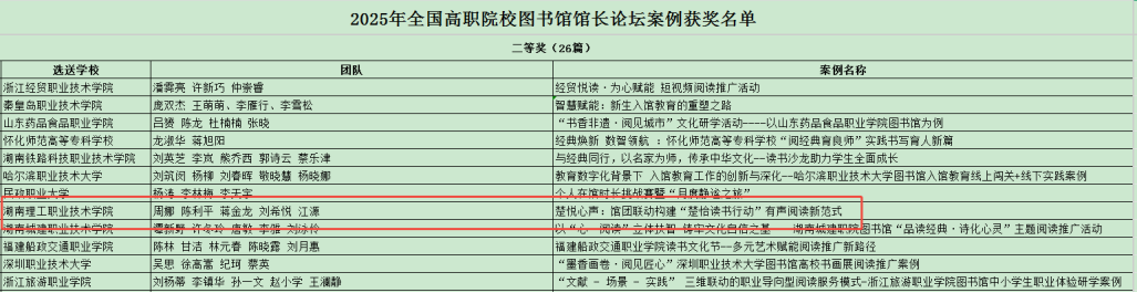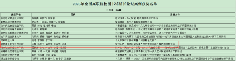 近日,在教育部高等学校图书情报工作指导委员会高职高专院校分委员会主办的“2025年全国高职院校图书馆馆长论坛案例与论文征集”活动中,我校提交的案例《楚悦心声:馆团联动构建“楚怡读书行动”有声阅读新范式》荣获二等奖。该案例由周娜、陈利平、蒋金龙、刘希悦、江源等老师共同完成。