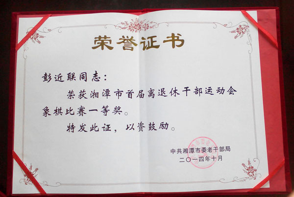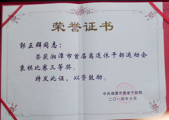 9月23日上午,湘潭市老干局在市老年大学召开了首届离退休干部运动会闭幕式。在闭幕会上,我院参加象棋比赛的退休职工彭近联、郭正群荣获了该项第一名和第三名的表彰奖励。