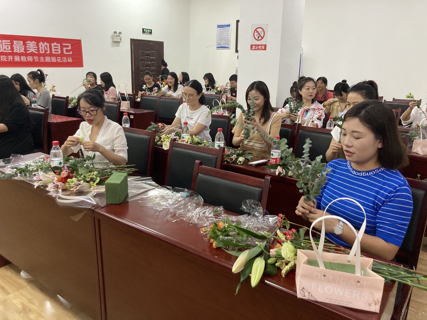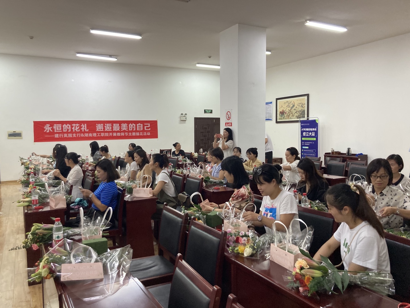 9月9日下午,为庆祝第三十七个教师节,向所有教师表达学院的关心与祝福,院工会、财务处联合岚园建行举办“永恒的花礼,邂逅最美的自己”主题插花活动。