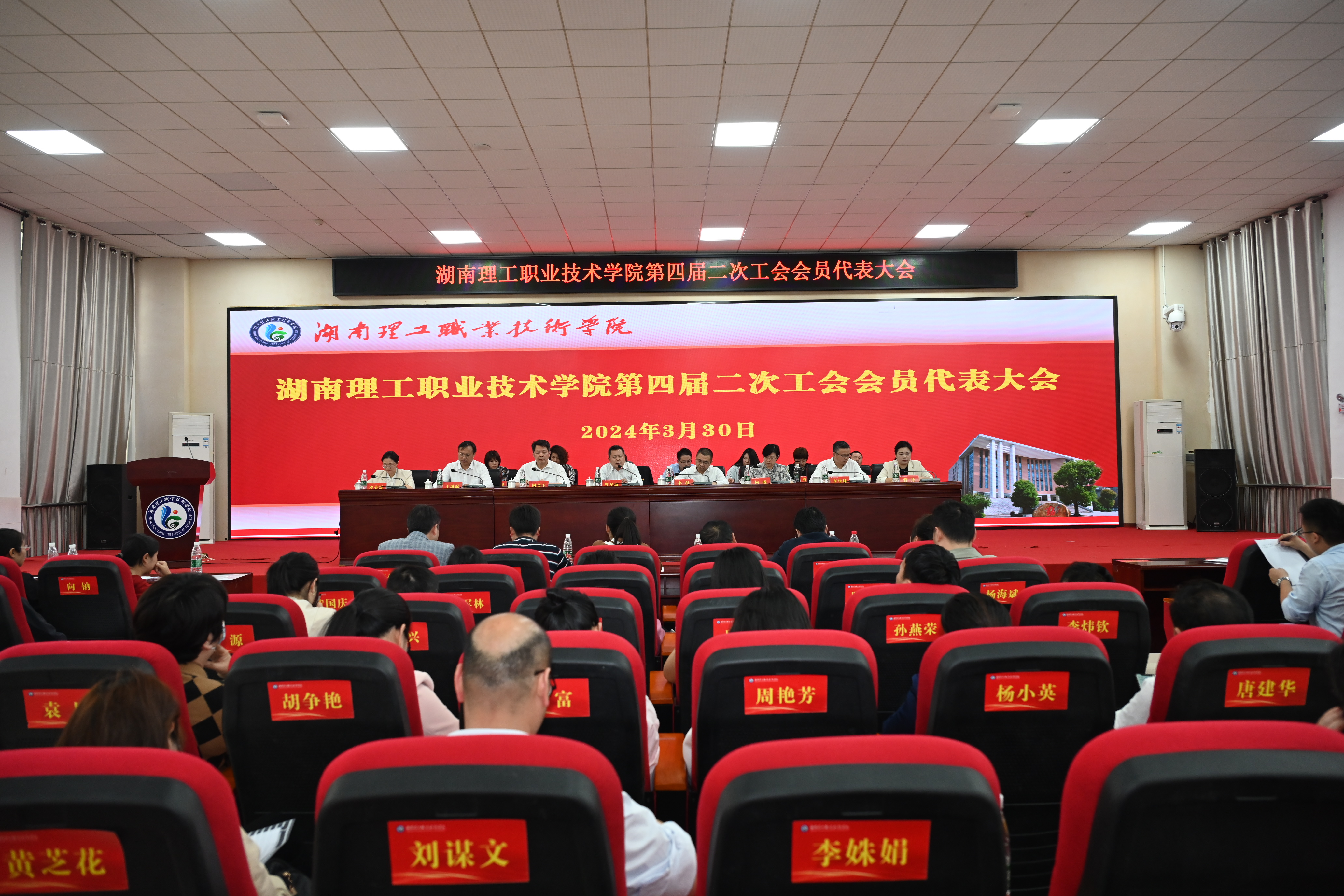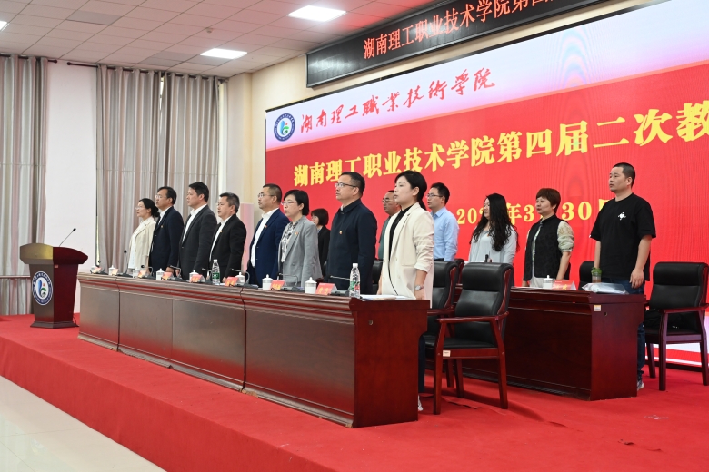 3月30日,湖南理工职业技术学院第四届教职工代表大会、工会会员代表大会第二次会议在博学楼报告厅举行,校党委书记叶星成,党委副书记、校长李科,全体党委班子成员出席会议。
