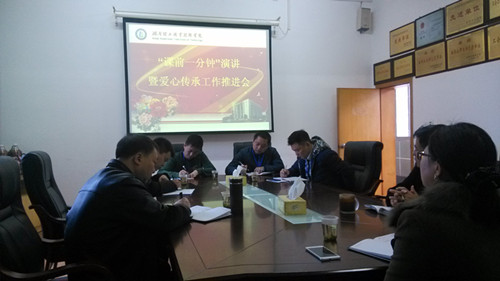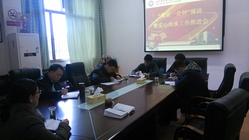 11月27日上午8:30,在学院办公楼接待室召开了“课前一分钟”演讲暨爱心传承工作推进会。学院党委书记秦裕武、副院长洪丕庆、团委书记罗美霞、学工处副处长沈立宁以及三系副书记参加会议。会议由副院长洪丕庆主持。