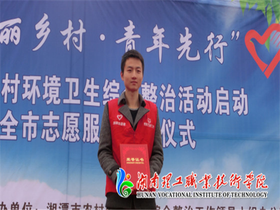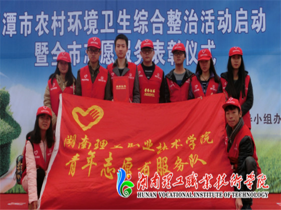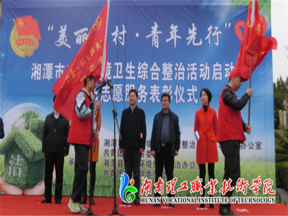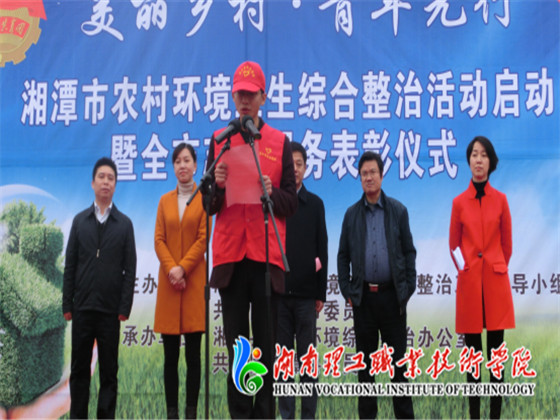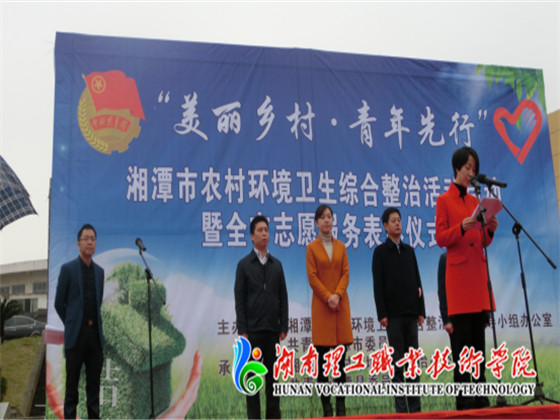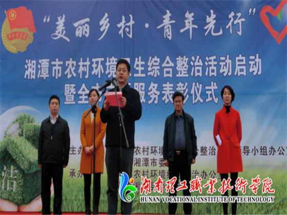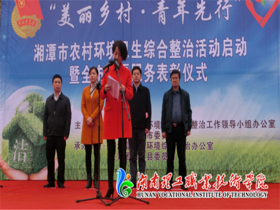12月4日上午,由湘潭农治小组、共青团湘潭市委主办的湘潭市“美丽乡村·青年之行”农村环境综合整治专项活动启动暨全市志愿者服务表彰仪式在湘潭县白石广场隆重举行。中共湘潭市委副书记严华、湘潭市人民政府副市长杨真平、共青团湘潭市委副书记李先金等领导出席,各高校、单位参加活动,我院志愿者服务中心受邀参加。活动由市整治办刘良丰主持。