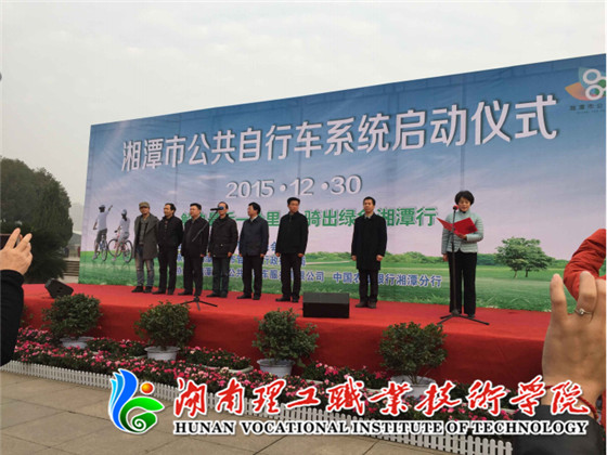 12月30日上午,湘潭市公共自行车系统启动仪式在东方红广场举行,出席领导有湘潭市委常委、副市长杨广,市人大常委会副主任潘爱民,市政协副主席周韶光,市政府副巡视员陶新水。市园林局、农行湘潭分行、我院学生代表等约600人参加仪式。