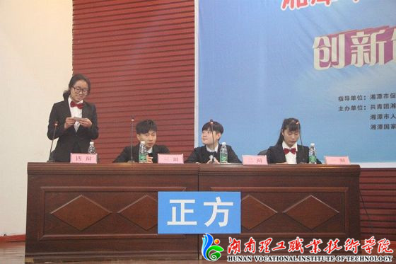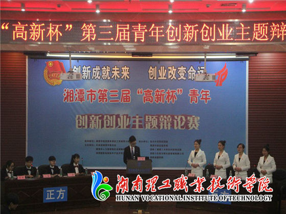 2016年3月26日上午,我校参加湘潭市“高新杯”第三届青年创新创业主题辩论赛。我校辩手表现出色,成功挺进四强。本次比赛由湖南省演讲与口才学会常务理事张克力、唐明、湘潭市演讲与口才协会副会长彭英担任评委。共青团湘潭市委副书记李先金、各院校领队老师,学生代表三百余人观看比赛。