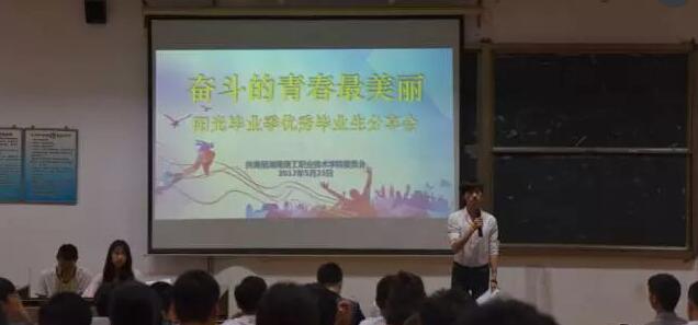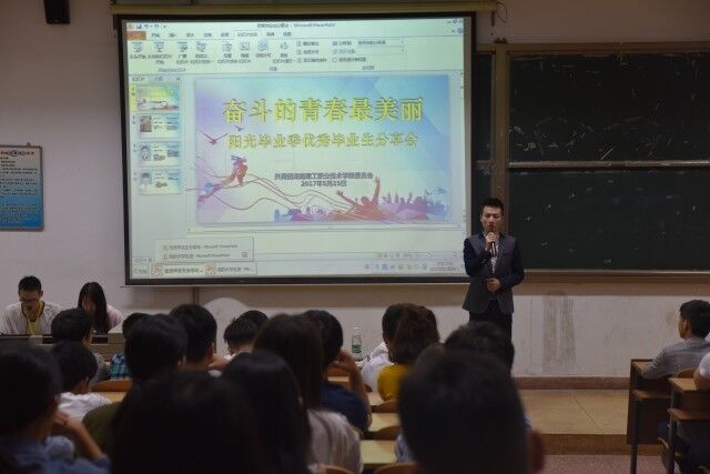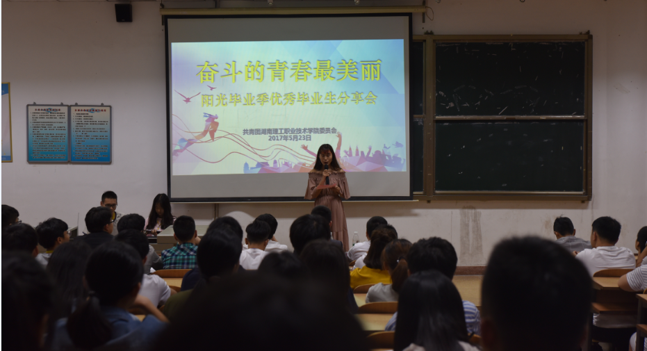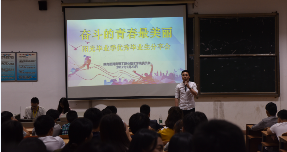 ??2017年5月23日晚上7点30,校团委以“奋斗的青春”为主题的阳光毕业季优秀毕业生分享会,在三教110举行。活动邀请了2014级三个学院优秀毕业生代表,进行分享座谈,分享大学成长经历。2015、2016级部分同学参加了此次分享会。
