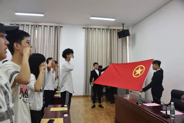 入团仪式在激昂的团歌声中拉开帷幕。首先,李强老师宣读了新团员名单,本次共发展团员36名,接着由老师们给新团员颁发团徽及团员证,全体新团员佩戴好团徽,在新团员代表朱坤鹏的的带领下,举起右手面对团旗庄严宣誓。