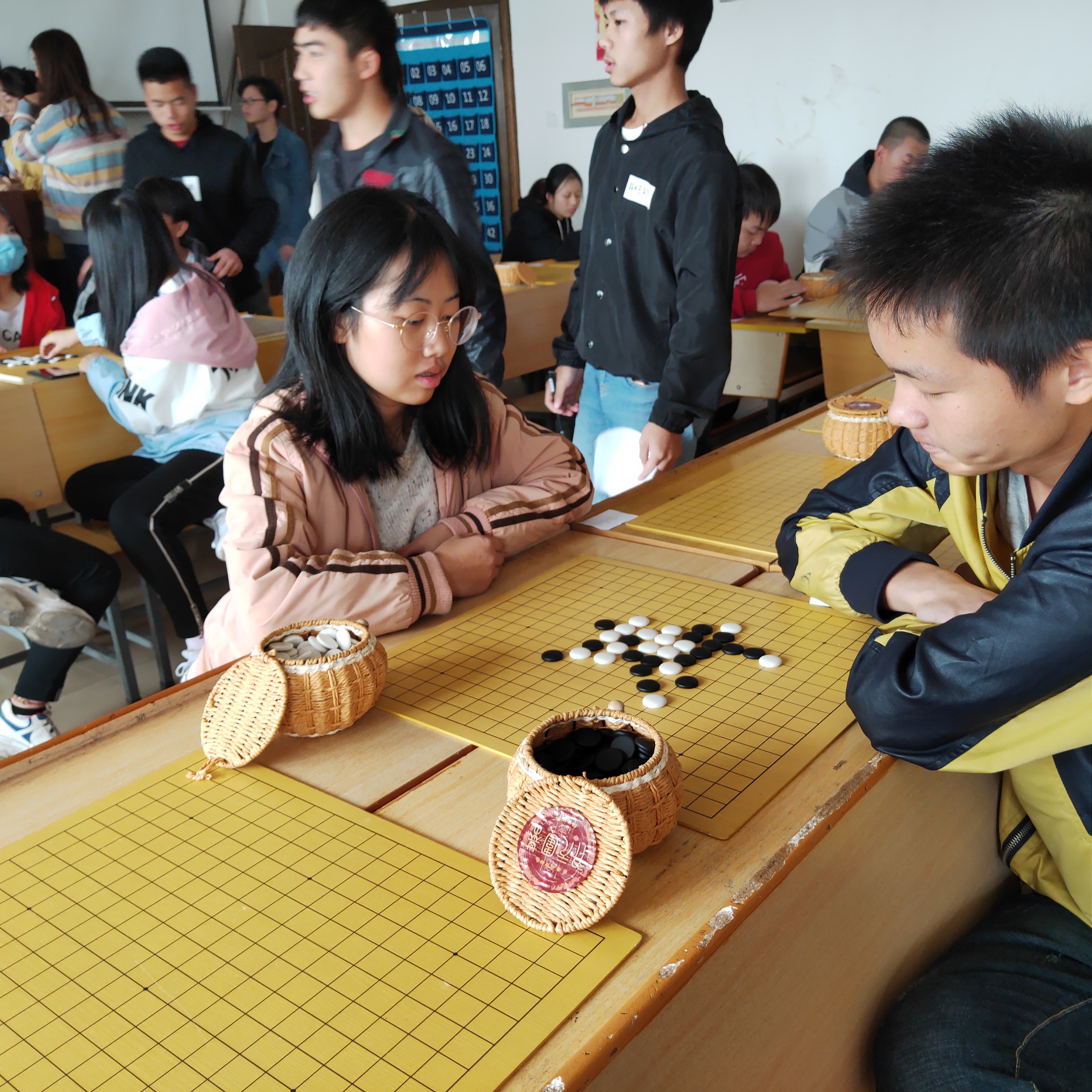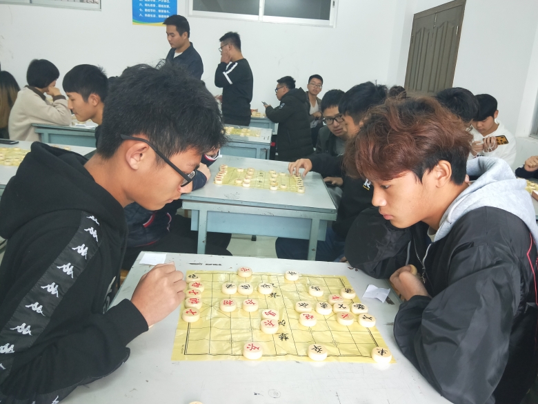 大赛于12月1日上午9点在明理楼510教室正式开始,紧接着裁判宣读了大赛的规则,进行现场抽签。本次比赛分中国象棋组和五子棋组,赛制分淘汰赛和积分赛。比赛中各位选手各显其能,率领各自兵马摆开阵势进行对垒。中国象棋组中,楚河汉界的对弈尤为激烈,你有“车”的长驱直入,我有“炮”的横空一抽,小兵小卒也是步步为营、稳扎稳打,你攻我守、你防我打。而在五子棋组中,场面相对安静,只听棋子落盘的声音,棋手们个个凝神沉思,充分展示出了自己的聪明才智与涵养。