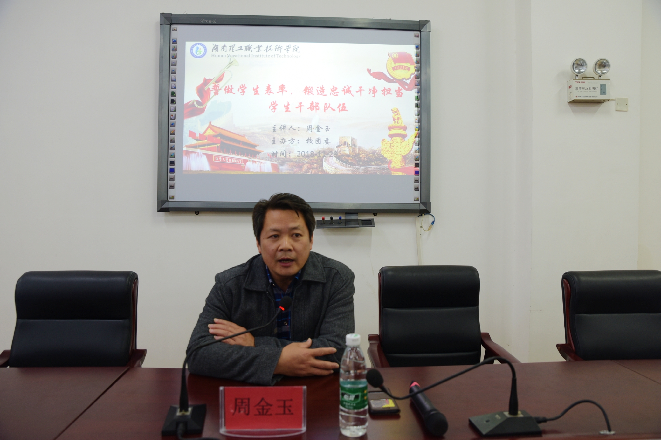 为加强学生干部思想建设,构建一支胸怀理想、品学兼优、作风扎实的学生干部队伍,11月29日,校团委邀请周金玉副校长在博学楼二会议室为主要学生干部做了题为“誓做学生表率,锻造忠诚、干净、担当的学生干部队伍”的专题团课讲座。校团委老师,各二级学院团总支书记一同聆听了此次讲座。