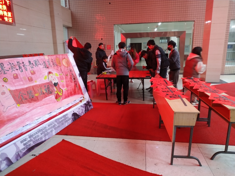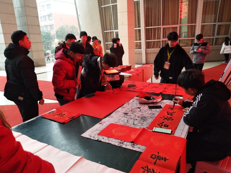书写现场,墨香十足,众多师生参与其中。“春临大地百花艳,节至人间万象新”“事事如意大吉祥,家家顺心永安康”……一幅幅春联,一张张福字,饱含着一句句温暖的祝福。师生们细细观赏,挑选着自己喜爱的春联。“用毛笔写出来春联比印刷的春联更有味道,让我们提前嗅到年的气息。”一名同学手捧着刚写好的春联说到。