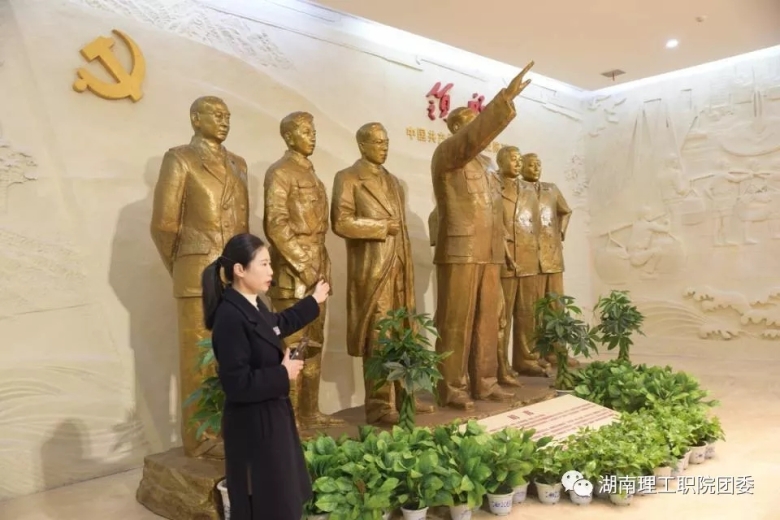 展标“领航——中国共产党湘潭历史陈列”在灯光的照射下闪闪发光,以毛泽东为首的湘潭共产党员先驱的雕像,不经让人肃然起敬。展览由序厅、觉醒、革命、建设、改革、筑梦、湘潭群英谱七个部分组成。一段段珍贵的文字,一幅幅泛黄的老照片,一件件承载了历史记忆的文物,立体、生动、形象地展示了中国共产党在湖南波澜壮阔而又绚丽多彩的光辉历史。
