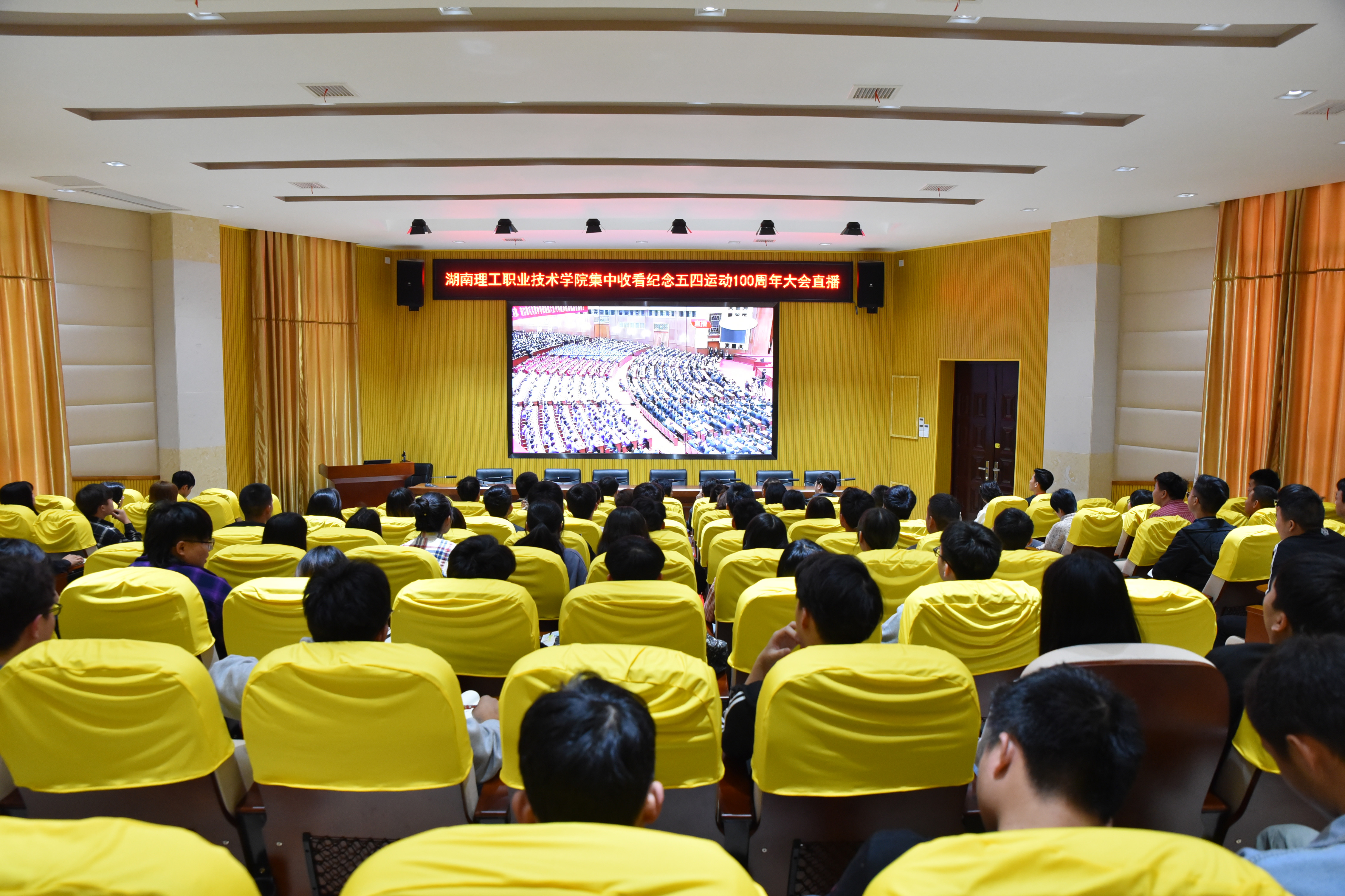 4月30日上午10点,我校在知行楼105教室组织师生集中观看了纪念五四运动100周年大会直播,校党委副书记朱奇卫,纪委书记刘洋,副校长周金玉以及各院部领导、老师,校团委委员、团学干部一起观看了直播。
