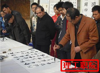 开幕式上,省书协大学生书法联合会秘书长吴章波代表湖南省书法协会作了重要讲话,同时授与我院 “湖南省书协大学生书法联合会理事单位”牌匾。院团委邓博文老师宣布巡回展理工职院展开幕。作品展一开始便吸引了许多老师和学生前来观赏,尤其是现场笔会,更是吸引了众人的驻足围观。伴着柔和的古典音乐,大家仿佛漫步于五千年的文化长廊中,品独具特色的艺术瑰宝。各位艺术家尽情挥洒翰墨,同学们热情高涨,现场笔会热闹的场面一直持续到中午12点半。