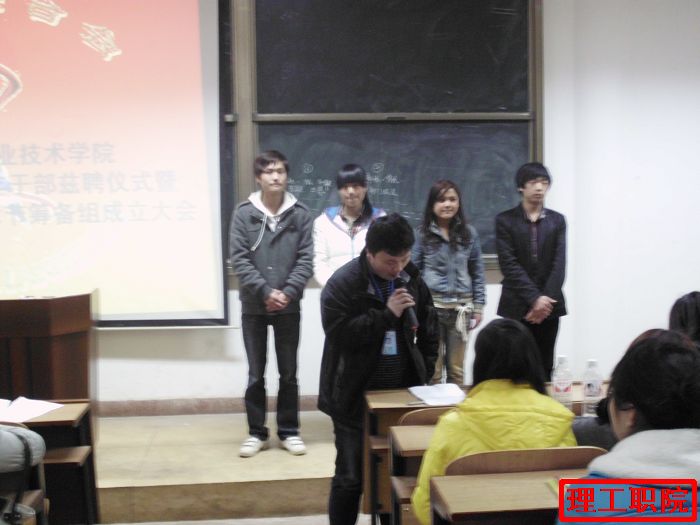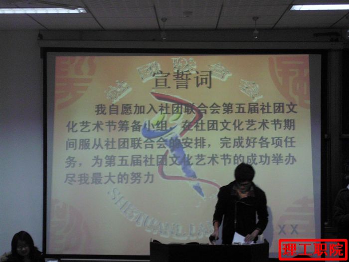 大会首先由院团委及社联指导老师赵宏宣读2011年社联兹聘干部名单,并为其颁发聘书,其次由社联主席徐胜关对本学期工作进行了布置,并宣布了第五届社团文化艺术节筹备小组的人员名单。接着主持人请全体到会人员起立,并宣读誓词。最后由院团委赵宏老师为本次会议做总结。赵老师对社联全体成员在上学期的工作给予了肯定,并要求其在本学期的工作中再接再厉,再创佳绩。