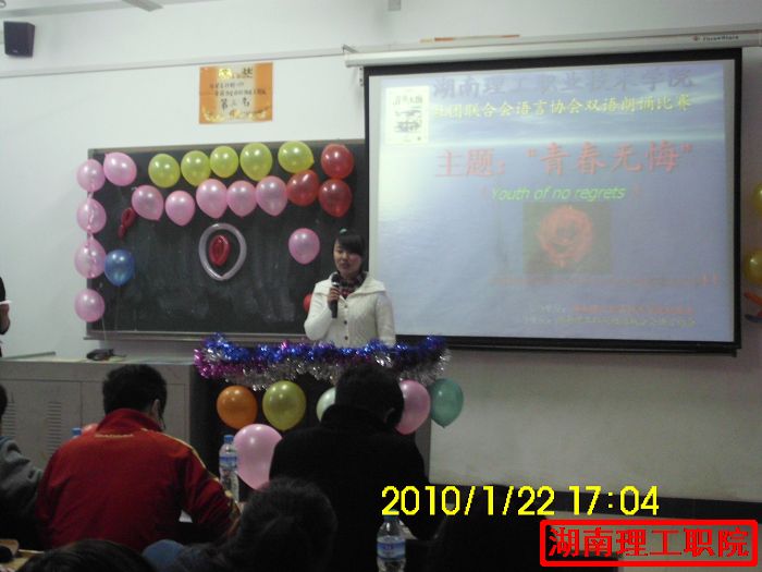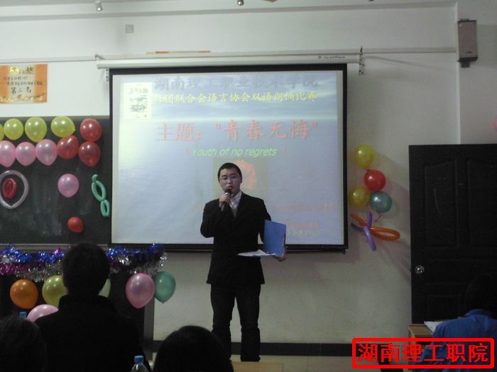 比赛坚持公平公开的原则,故采用抽签的方式,依次进行比赛。首先,在大家的掌声中,主持人吴红霞宣读了此次比赛的规则和评分标准。接着,参赛选手鳞次栉比的纷纷上台朗诵,他们那抑扬顿挫,饱含深情的精彩朗诵惊服了在座的每一个人,其中包括英文朗诵和中文朗诵,朗诵的主题皆围绕“青春无悔”,展现了我们现代青年人的青春面貌,渐渐的,听完了十九位参赛选手的精彩朗诵后,比赛在此完美的告一段落,最后,由我院社团联合会主席雷晋超对此次比赛进行总结和点评,教导我们在以后的比赛中要注意衣着、站姿、礼貌等礼仪。