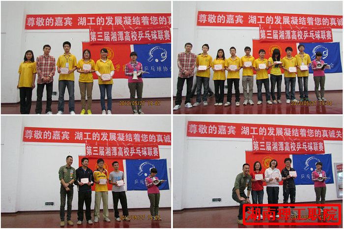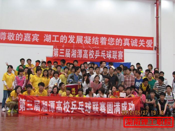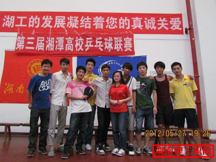 为了继承与发扬湘潭乒乓球联赛,加强湘潭市各高校友好往来,致力于打造湘潭高校的品牌体育赛事,弘扬"团结合作,拼搏进取"的国球精神,为各位乒乓球爱好者提供一个展示风采、相互学习进步的平台,5月26、27日由湖南工程学院体育教学部共青团湖南工程学院委员会主办,湖南工程学院社团联合会乒乓球协会承办湘潭市各大高校乒乓球协会协办的第三届湘潭高校乒乓球联赛于湖南工程学院新体育馆乒乓球室如期举行.参加这次比赛的学校有湖南科技大学、湘潭大学、湖南工程学院、湖南软件职院、湖南电气职院、湖南城建职院、湖南理工职院。我院有9名选手(4男1候补、3女1候补)参加了此次比赛.