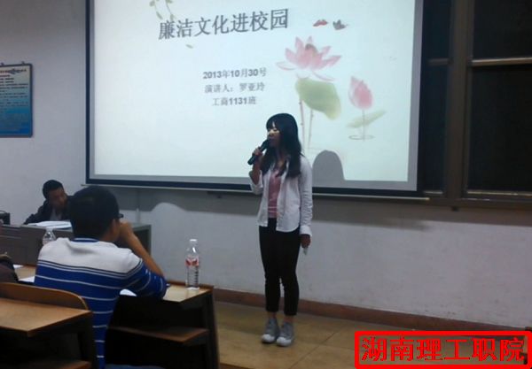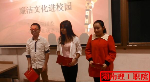 “出淤泥而不染,濯清涟而不妖”提倡勤俭节约,适度消费,杜绝学生中相互攀比的消费行为;,不成方圆和严于律己,宽以待人等校园廉洁准则,事在是非,公无远近和知足常足,终身不辱等典故教育学生,激发大学生对道德模范的崇敬之情,为学生奠定了传承高尚道德,终生廉洁做人的思想基础;语言协会特组织学生开展学习道德模范演讲;并要求全院学生廉洁从学,自觉接受老师和学生会成员的监督,为学院树立榜样。此次比赛不仅是展现学生才能的时候更能体现出他们心中的廉洁!